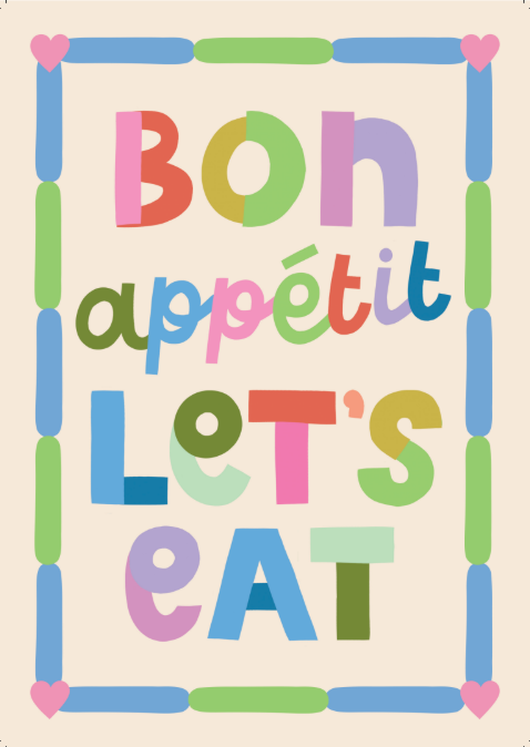 Refresh availabilityBrighten up your kitchen, dining area, or café with this colourful and cheerful print that says it all: Bon appétit, let’s eat! Bursting with bold, multi-coloured typography and a border of whimsical shapes (including sweet pink hearts!), this artwork is a joyful celebration of good food and good company.
