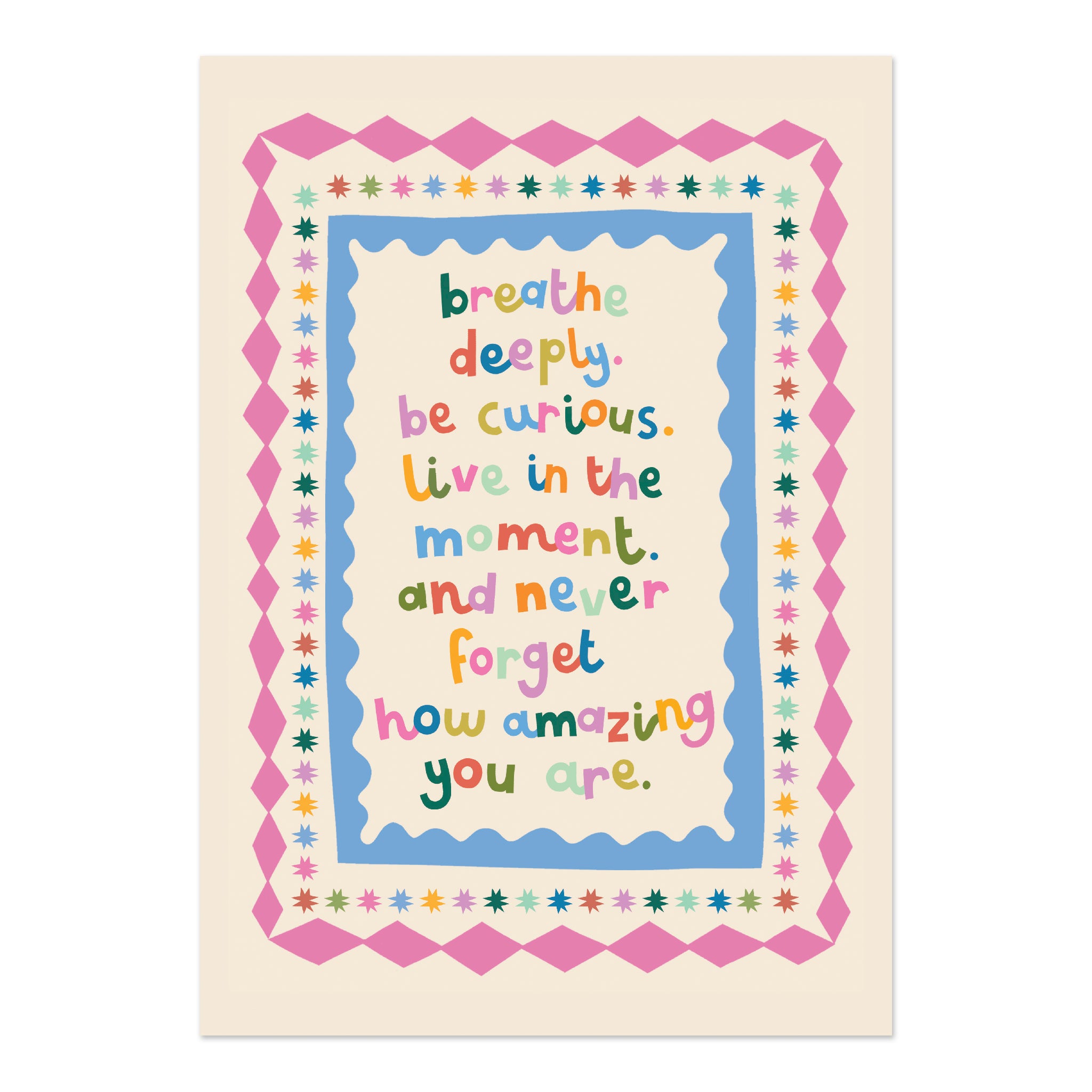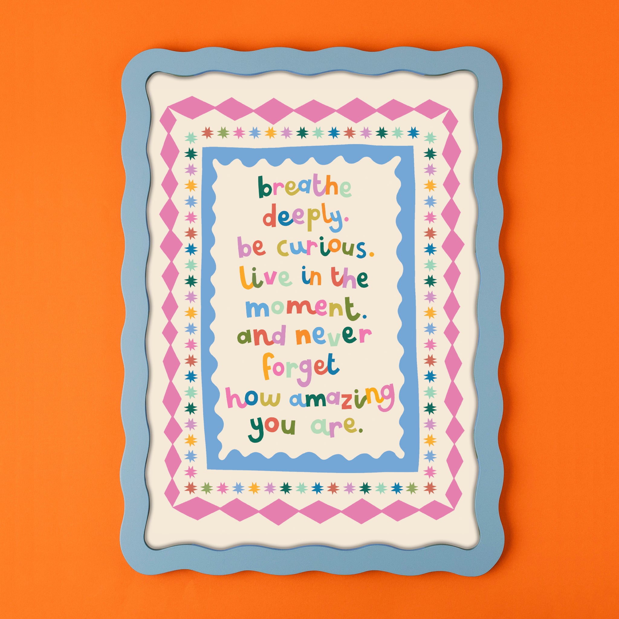 Refresh availabilityBrighten up your space with a daily reminder to slow down and shine. This playful, colourful print features uplifting words to help you pause, breathe, and embrace the beauty of the present moment. With its cheerful hand-lettered design and vibrant border, it’s the perfect blend of positivity and style - ideal for your home, office, or as a thoughtful gift.