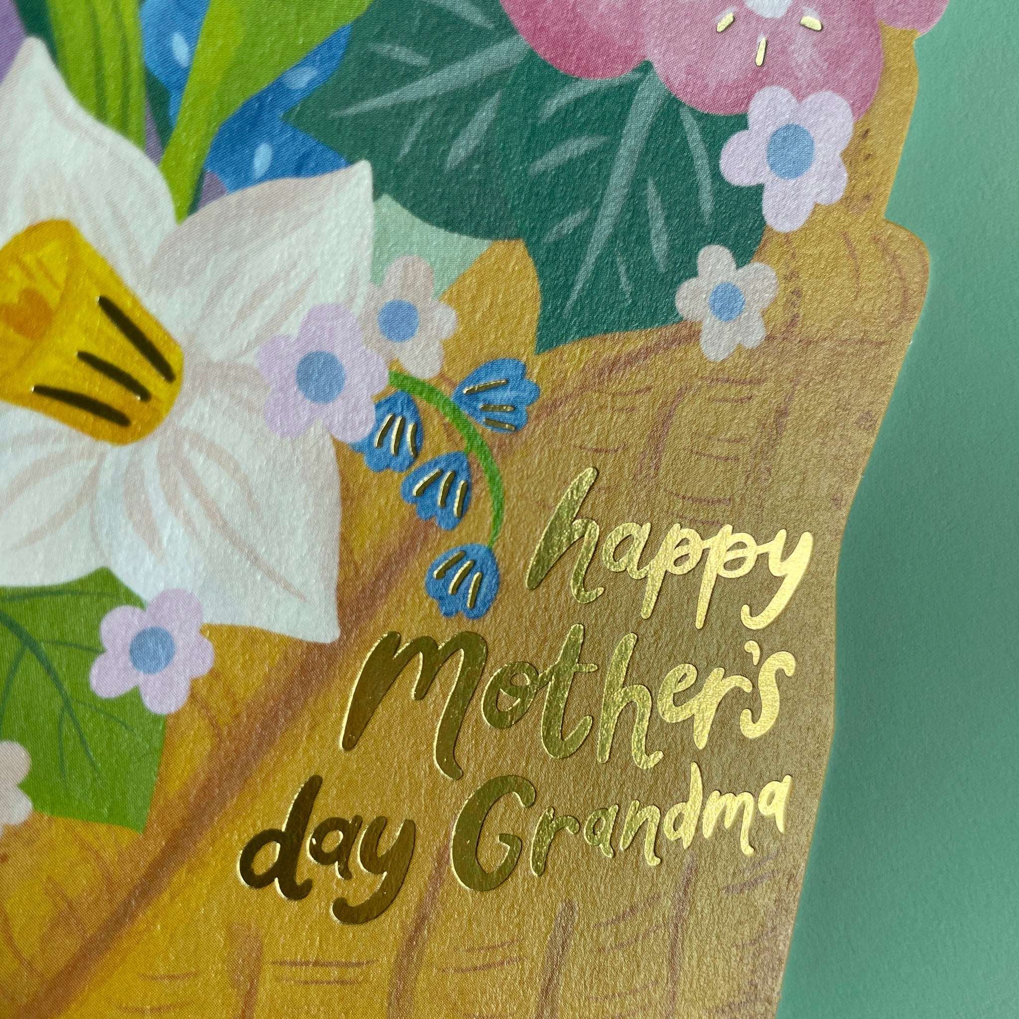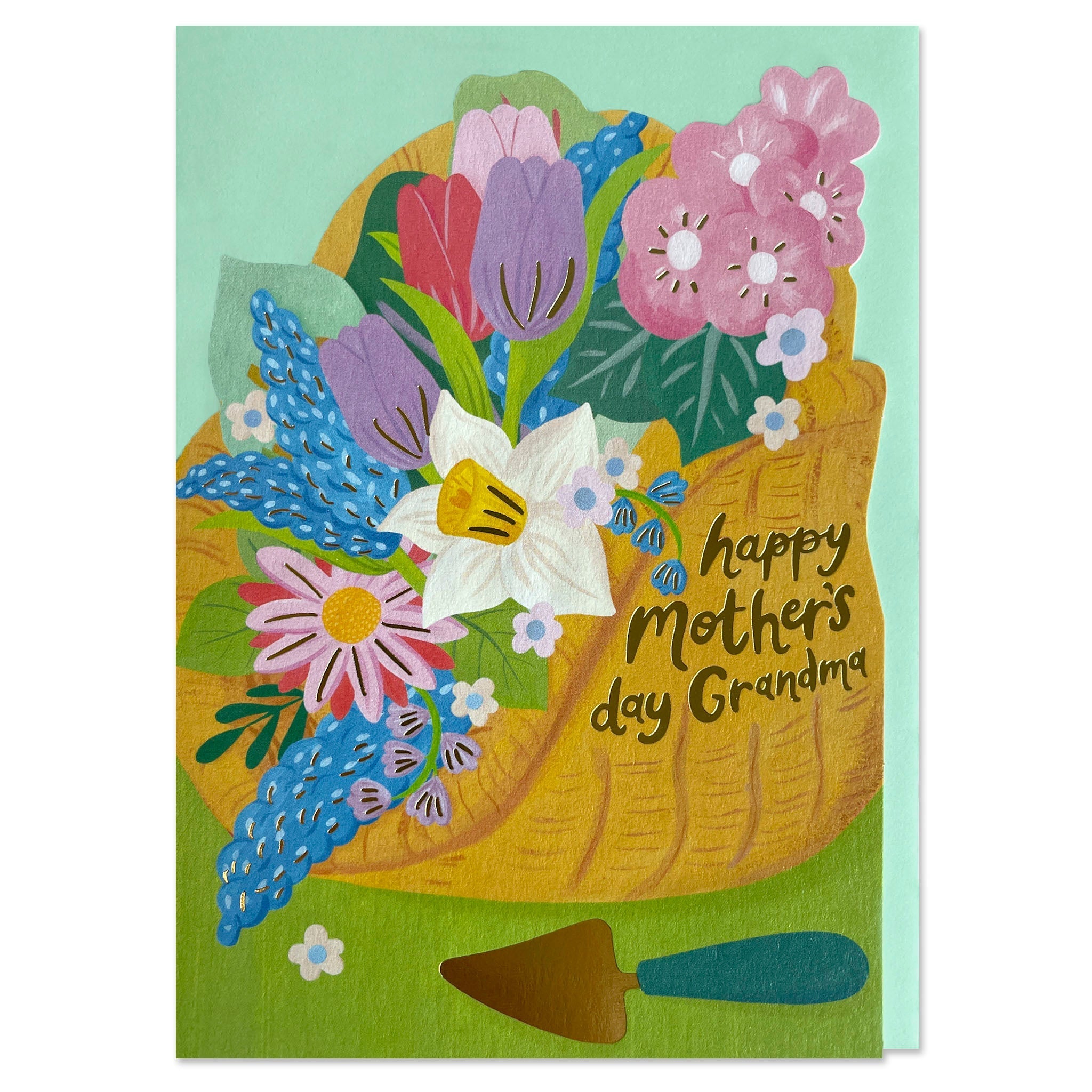 Filled with lots of wonderful blooms, this Mother's Day card for the special Grandma features a woven wooden gardeners trug perfect for the green fingered Grandparent. This card features a die-cut shape and the gold foil adds a touch of luxury to the finer design details.