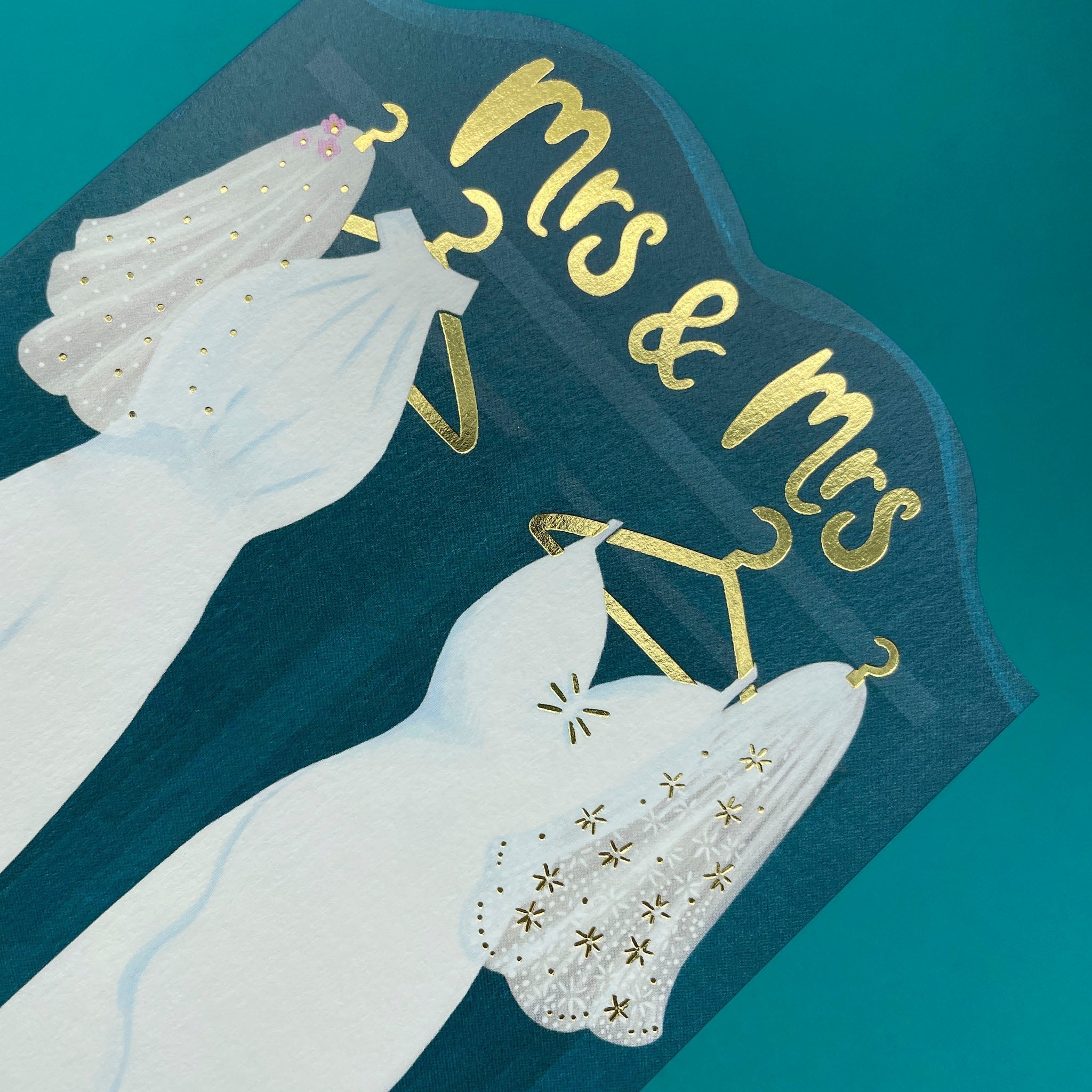 A card featuring wedding outfits for the big day, finished with gold details and beautiful 'Mrs & Mrs' luxe foil lettering.